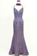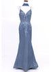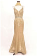 Chicas C-243 mermaid style sparkle gown with embroidered lace and deep V-neck.