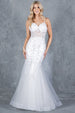 An elegant, romantic, modern corset mermaid gown with a fitted bodice featuring intricate lace embroidery adorned with floral motifs, beads, and pearls. The sweetheart neckline adds a romantic touch, while thin spaghetti straps offer light support. The skirt is fitted through the hips and gradually flares into a mermaid silhouette. A tulle overlay adds volume and a dreamy effect, creating soft movement. The delicate embroidery continues down the skirt, further enhancing the gown's elegance.