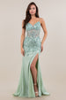 Cinderella Couture 8329J sparkle satin prom, homecoming, evening gown, accented with hand beading and sequins. This beautiful gown has a sheer bodice with boning. Back zip and train. Sizes 0 to 16.