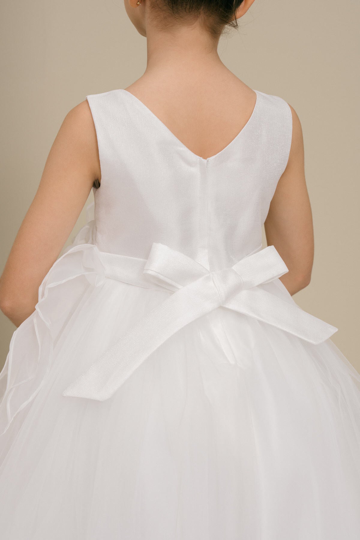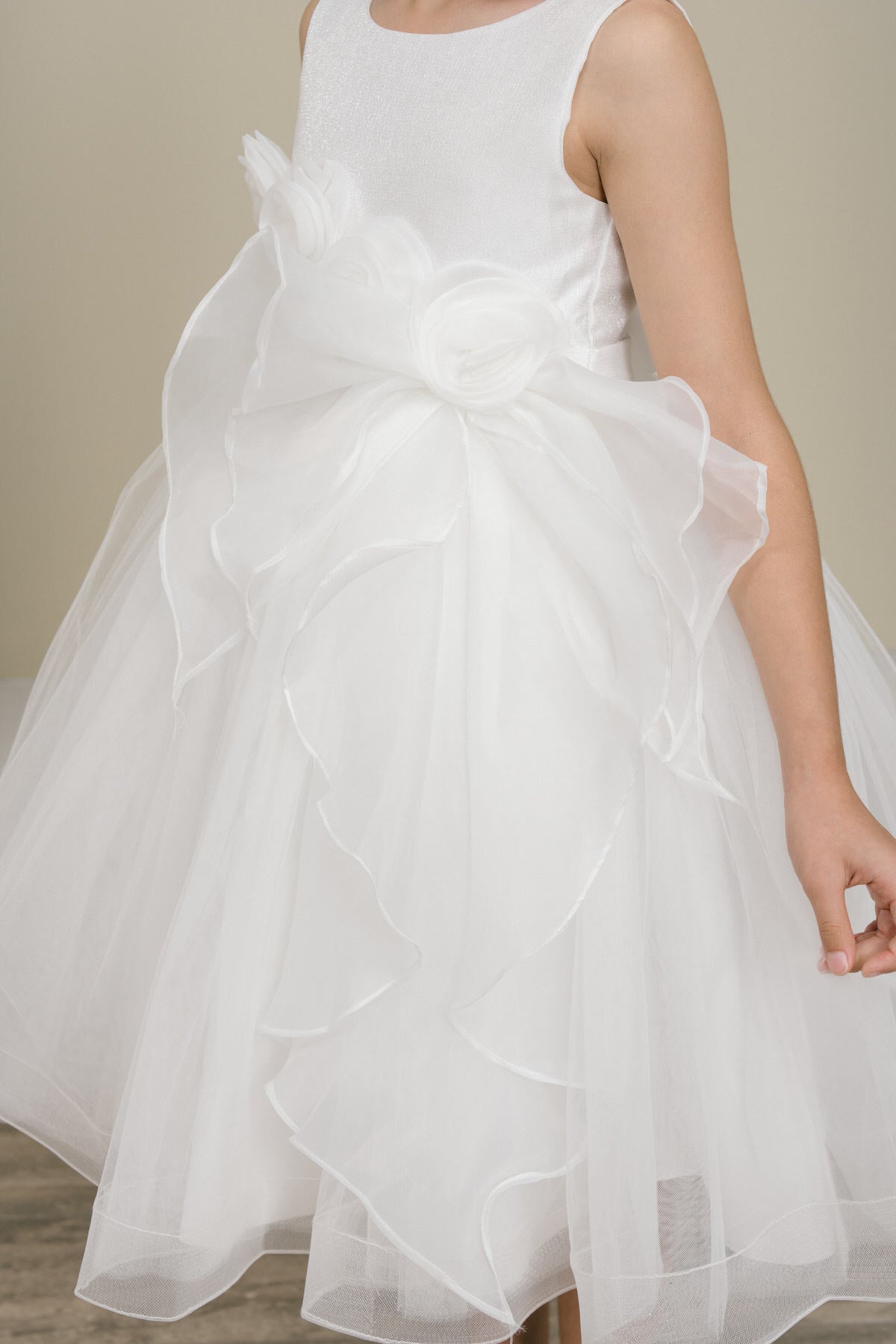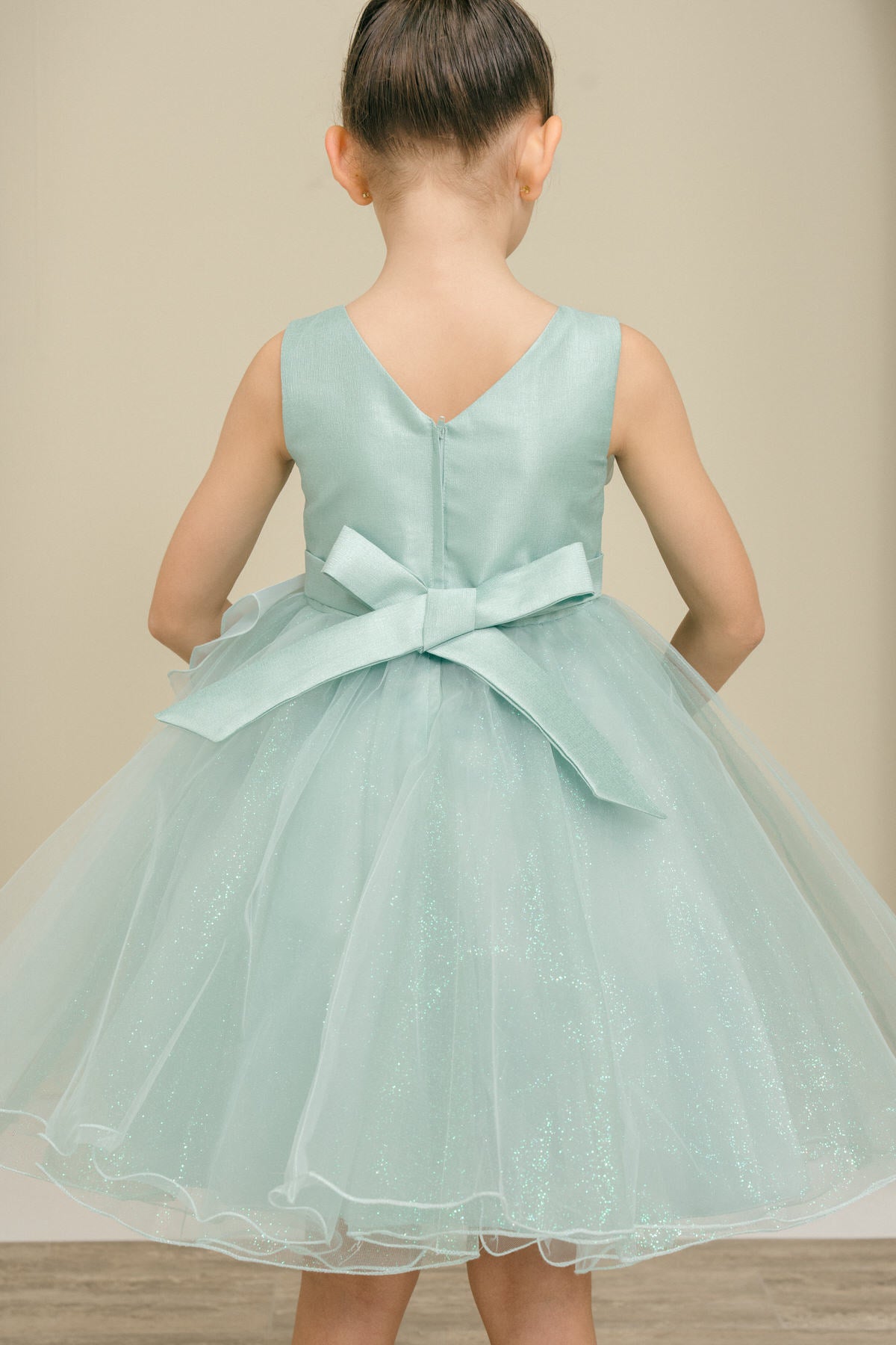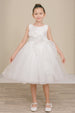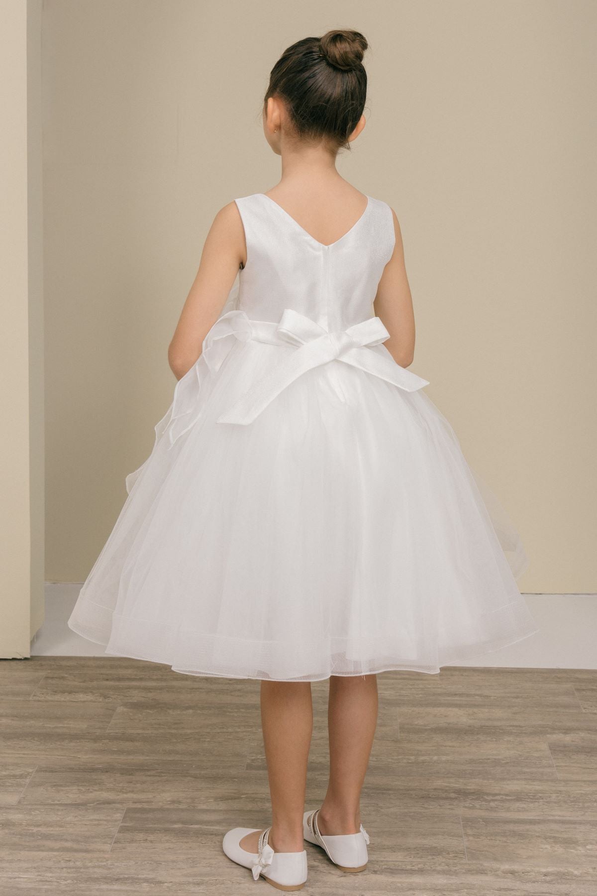 Adorable Cinderella Couture 9128 sparkle tulle flower girl dress. This sweet little dress has a dramatic floral sash accent across the bodice of the dress. Knee length, zips and sash ties in the back. Sizes 2 to 14.