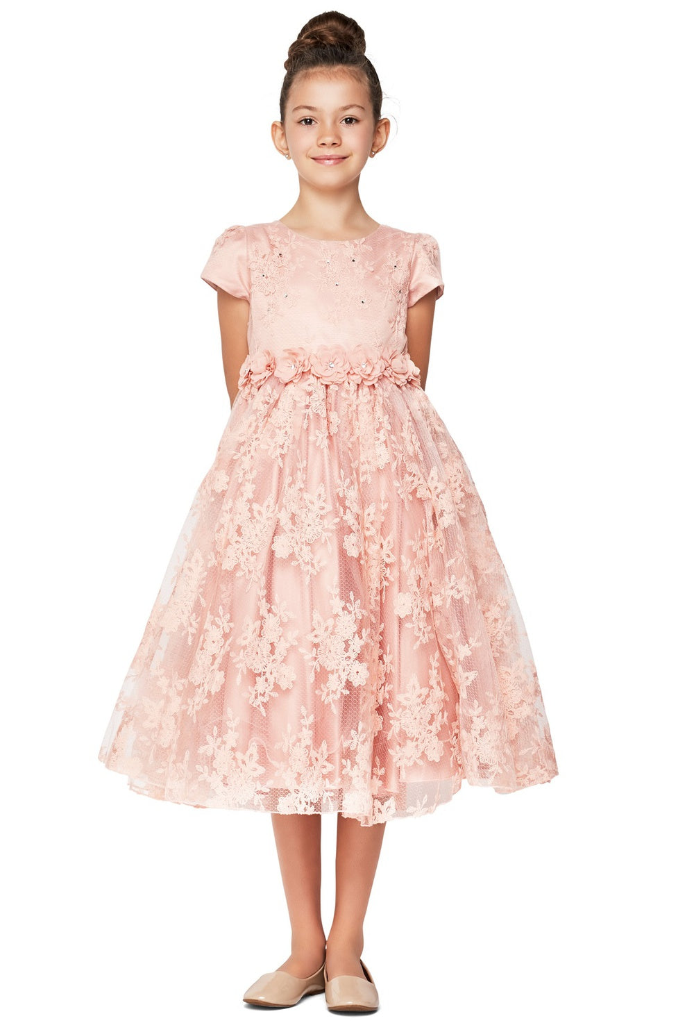 Elegant French Chantilly lace cap sleeve T-length dress with chiffon flowers with rhinestone, satin back sashes. Sizes 2 to 12.