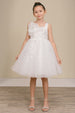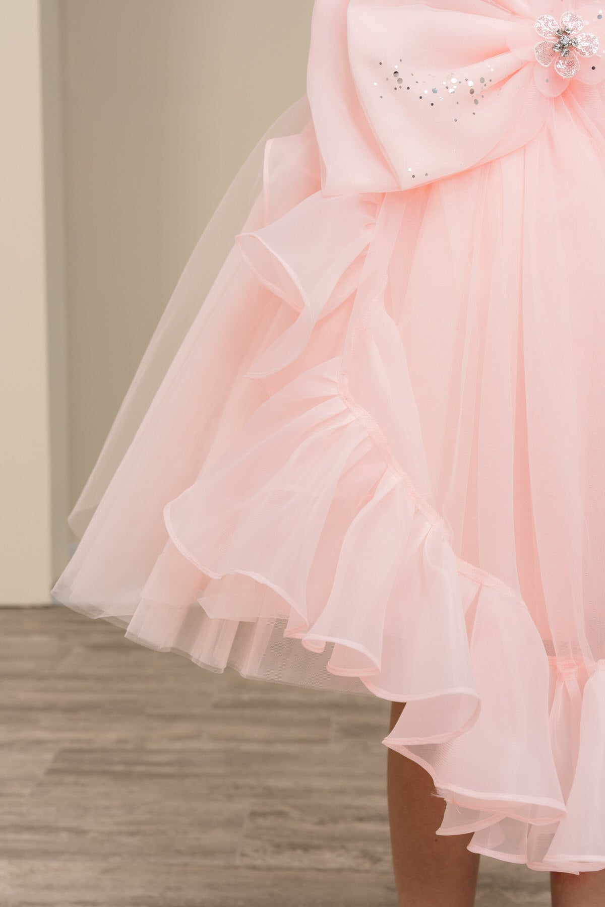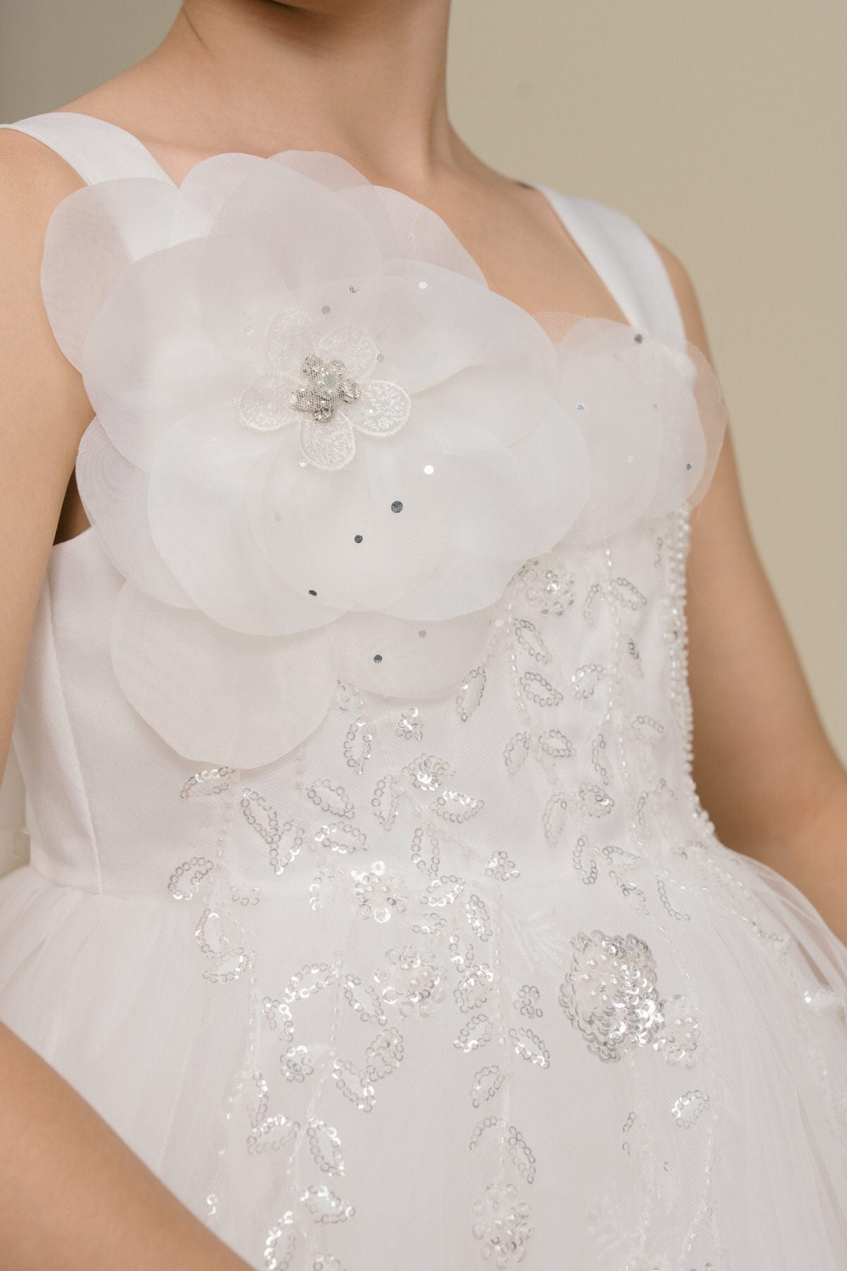 Elegant floral embellishments ruffle back dress for a perfect flower girl, birthday, or any formal event where a princess-like look is desired. A large fabric flower with sequin details and rhinestones on the shoulder, delicate embroidery & sequins makes the bodice adorned with intricate floral embroidery and shimmering sequins. A voluminous layered tulle skirt adds a fairytale-like elegance. The dress has a large satin bow with sparkling accents, creating a dramatic yet charming effect with cascading ruffles for added volume and movement.