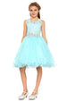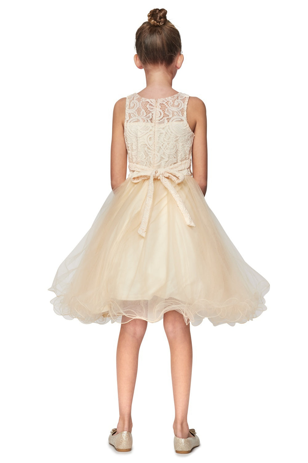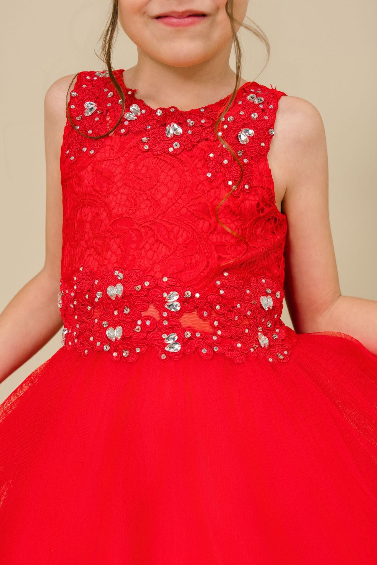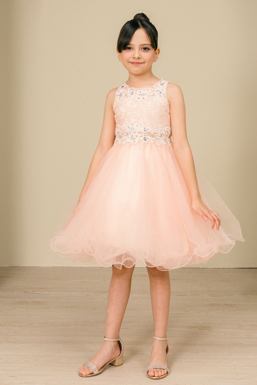 This is a sleeveless illusion lace dress, crafted with handmade design rhinestone lace, decorated around the neckline and waistline, super soft tulle skirt wired on the bottom for cuteness. This a perfect dress for all occasions.