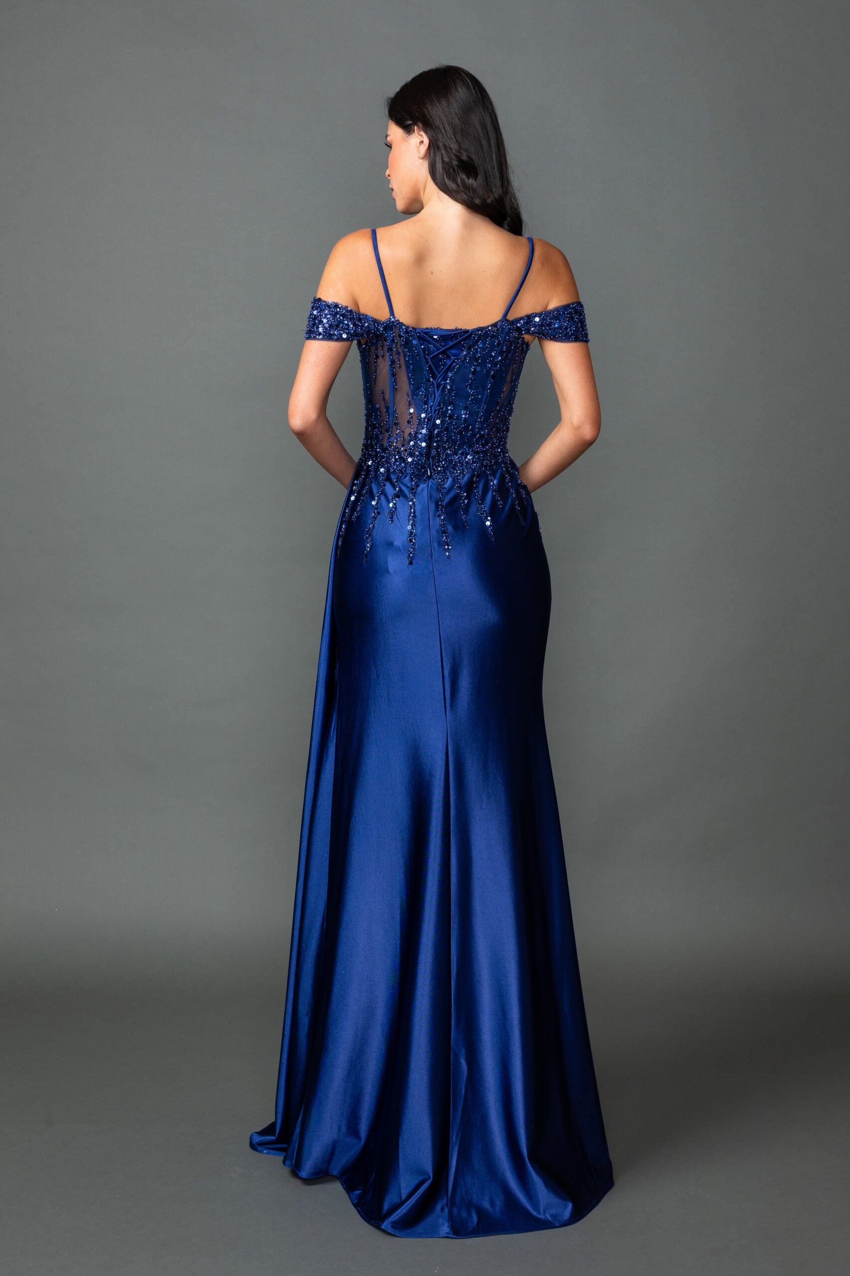 Prepare to turn heads in this show-stopping Dancing Queen 4551 gown that's pure glamour from every angle. The heavily sequined off-shoulder bodice catches the light with every move, while the sheer, boned midriff adds an alluring touch of sophistication. A supportive corset back with privacy panel keeps you comfortable and confident all night long, and the dramatic leg slit ensures you can dance without missing a beat. Crafted in luxurious stretch satin, this gown moves with you, delivering sparkle, support, and serious style for prom, formal events, or any occasion that calls for a showstopper.