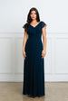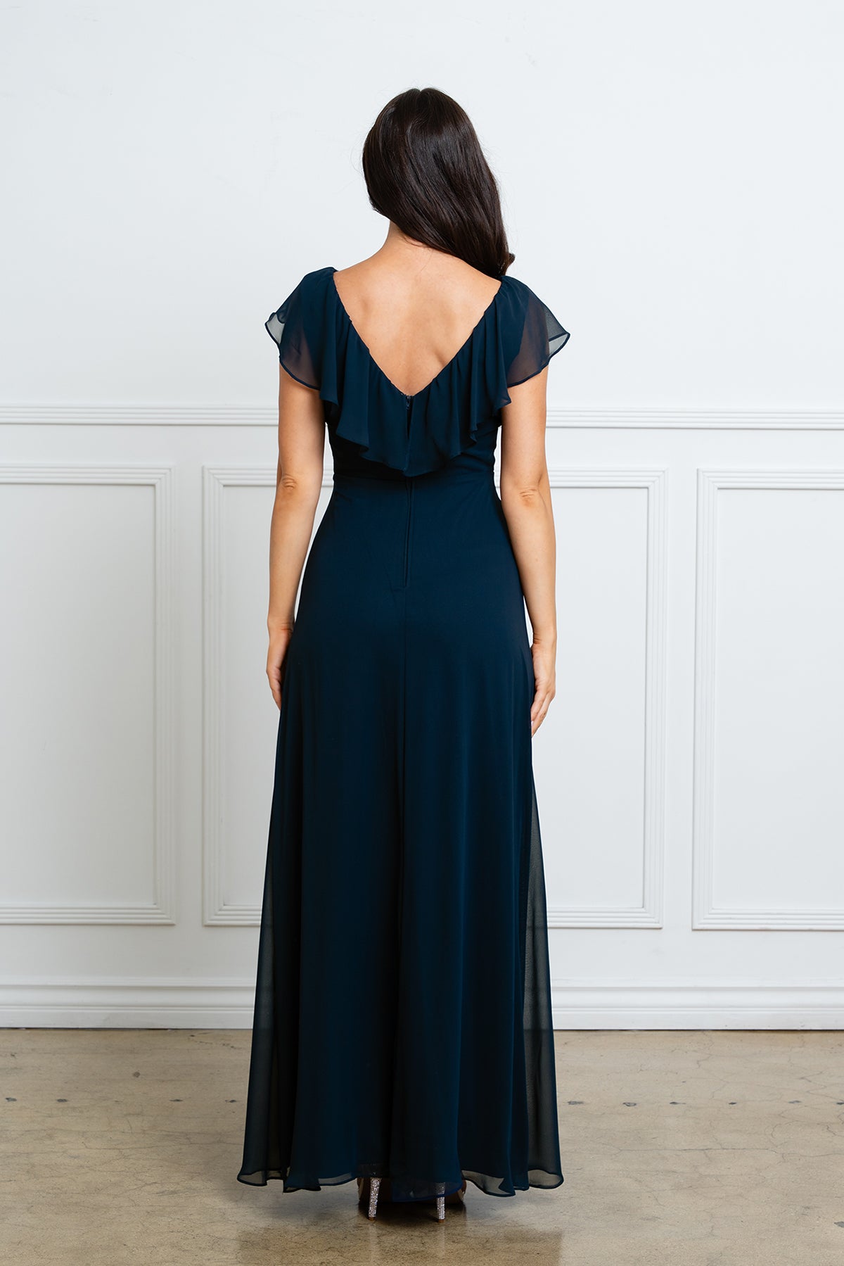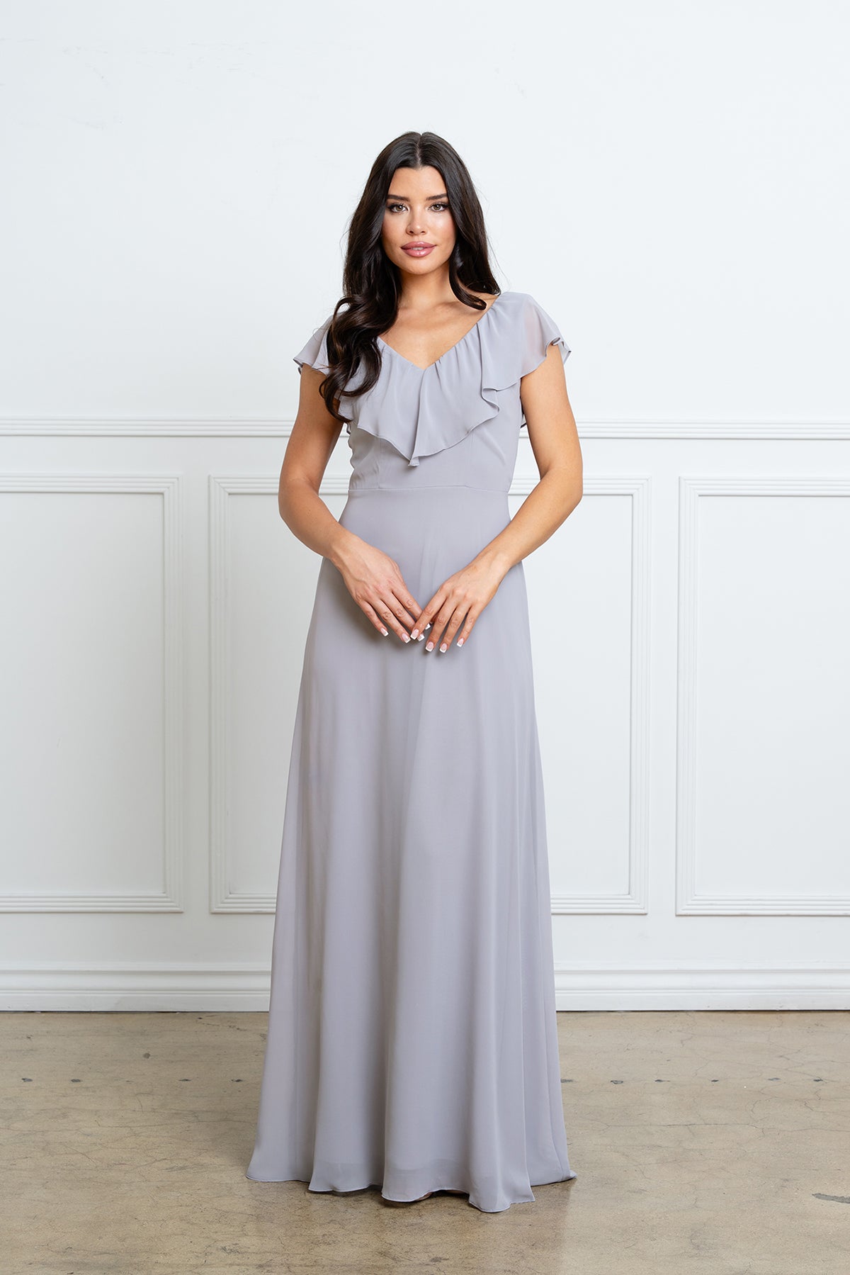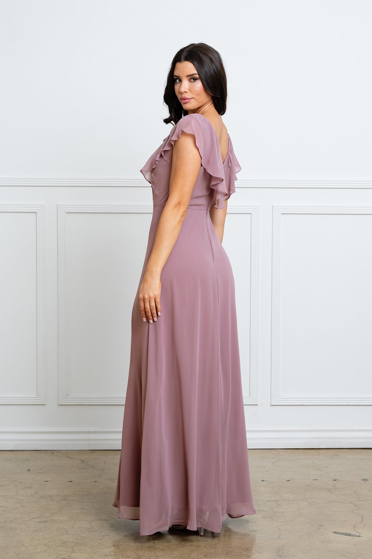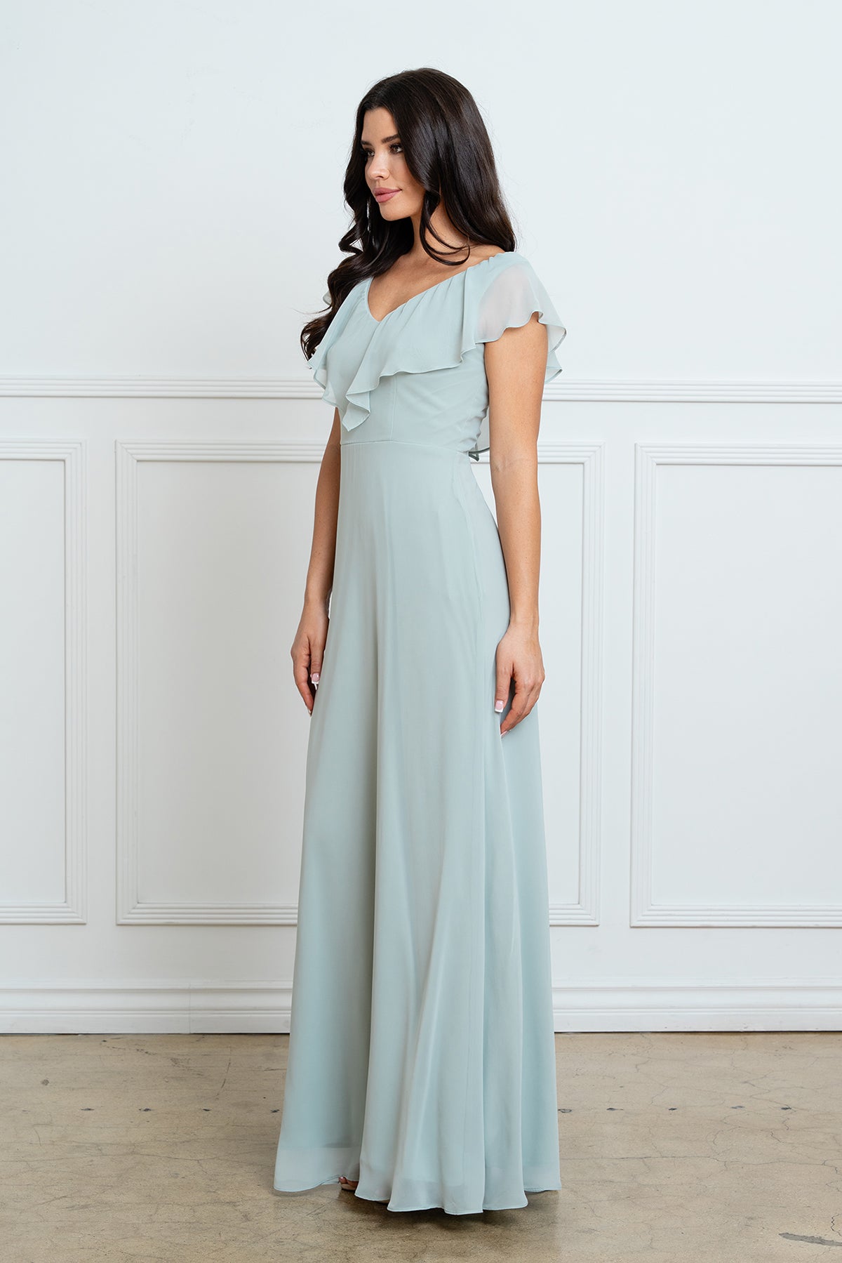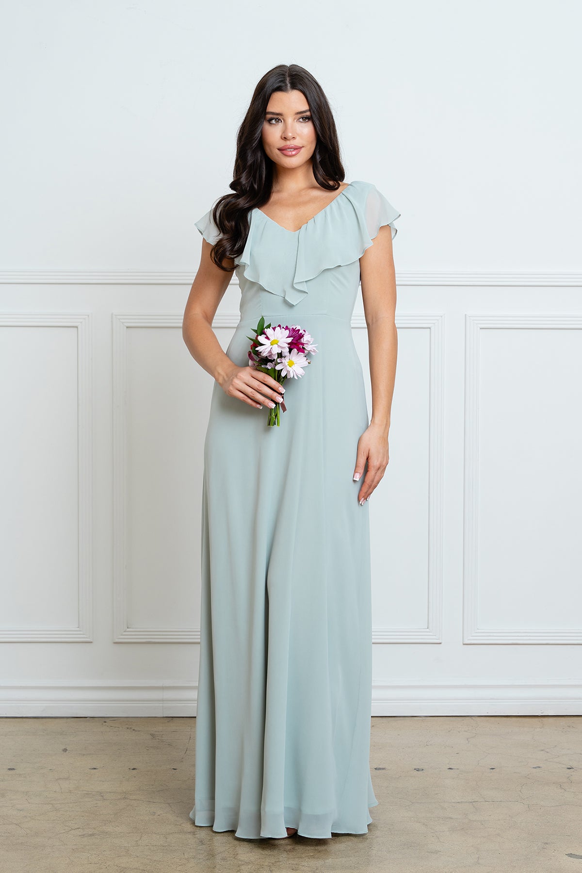 Eva USA 3328. Timeless elegance meets modern simplicity in this classic chiffon gown. The floor-length silhouette features a graceful ruffle V-neckline that flows seamlessly to a matching V-back, creating an effortlessly refined look. Delicate flutter sleeves add movement and femininity, while the concealed back zipper ensures a seamless finish. Crafted in lightweight chiffon, this versatile dress transitions beautifully from bridesmaid duties to formal occasions, offering understated sophistication for any special event.