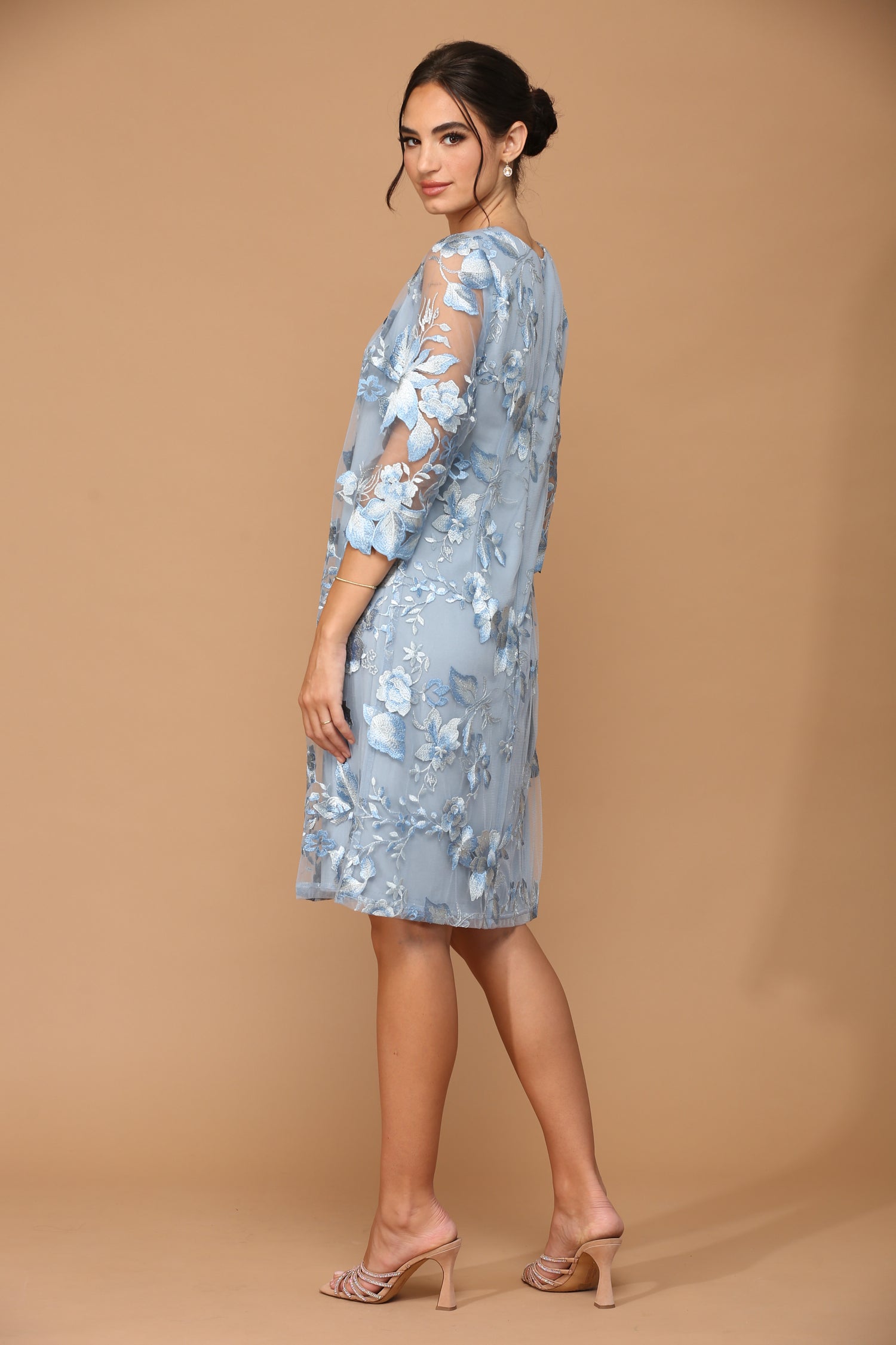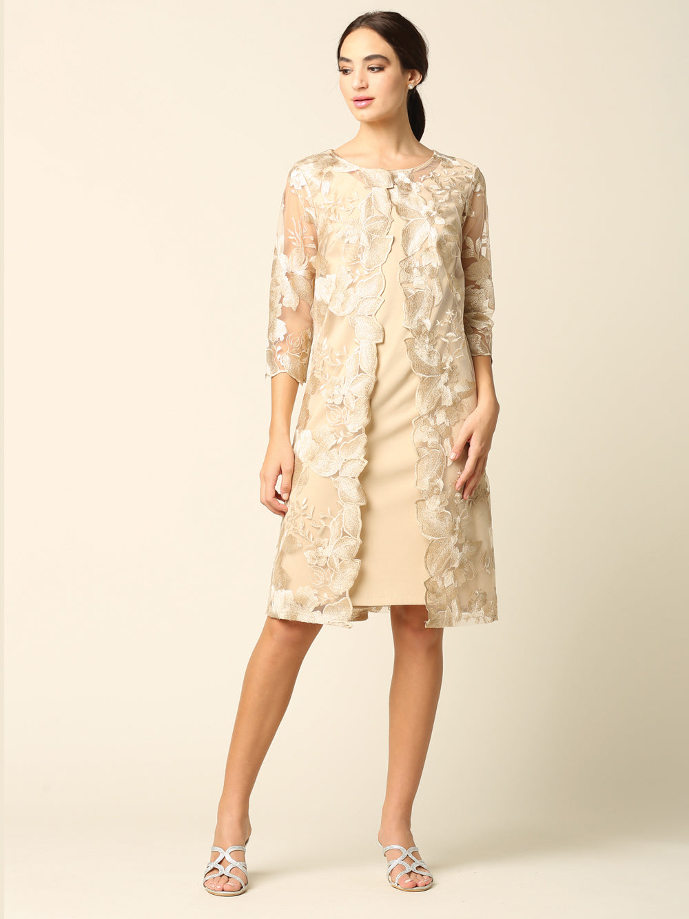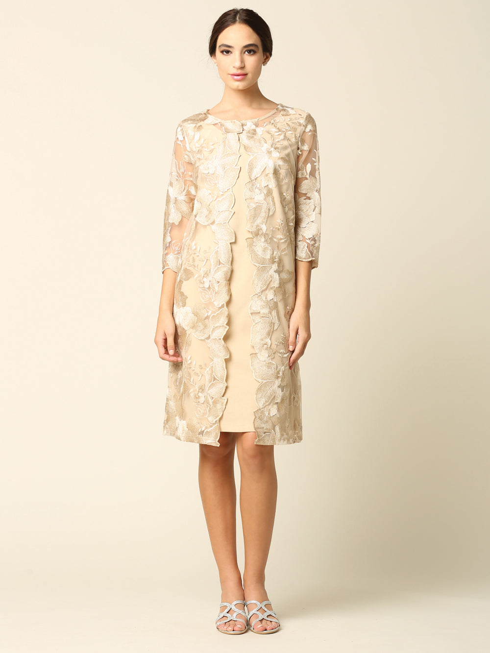 Knee length lace mother of the bride or groom dress with attached lace jacket. Fully lined with built in bra. Back zip. Sizes S to 5X