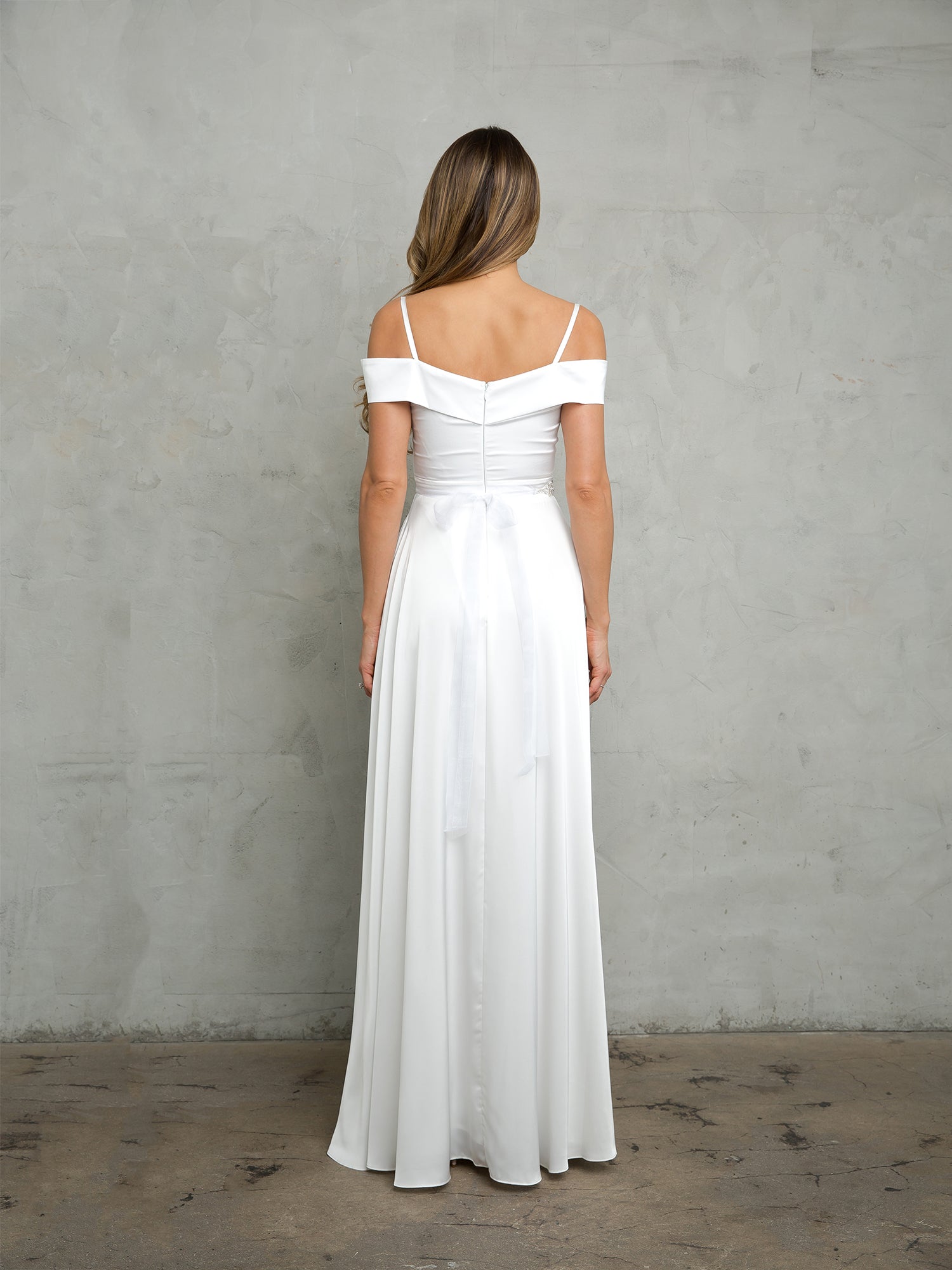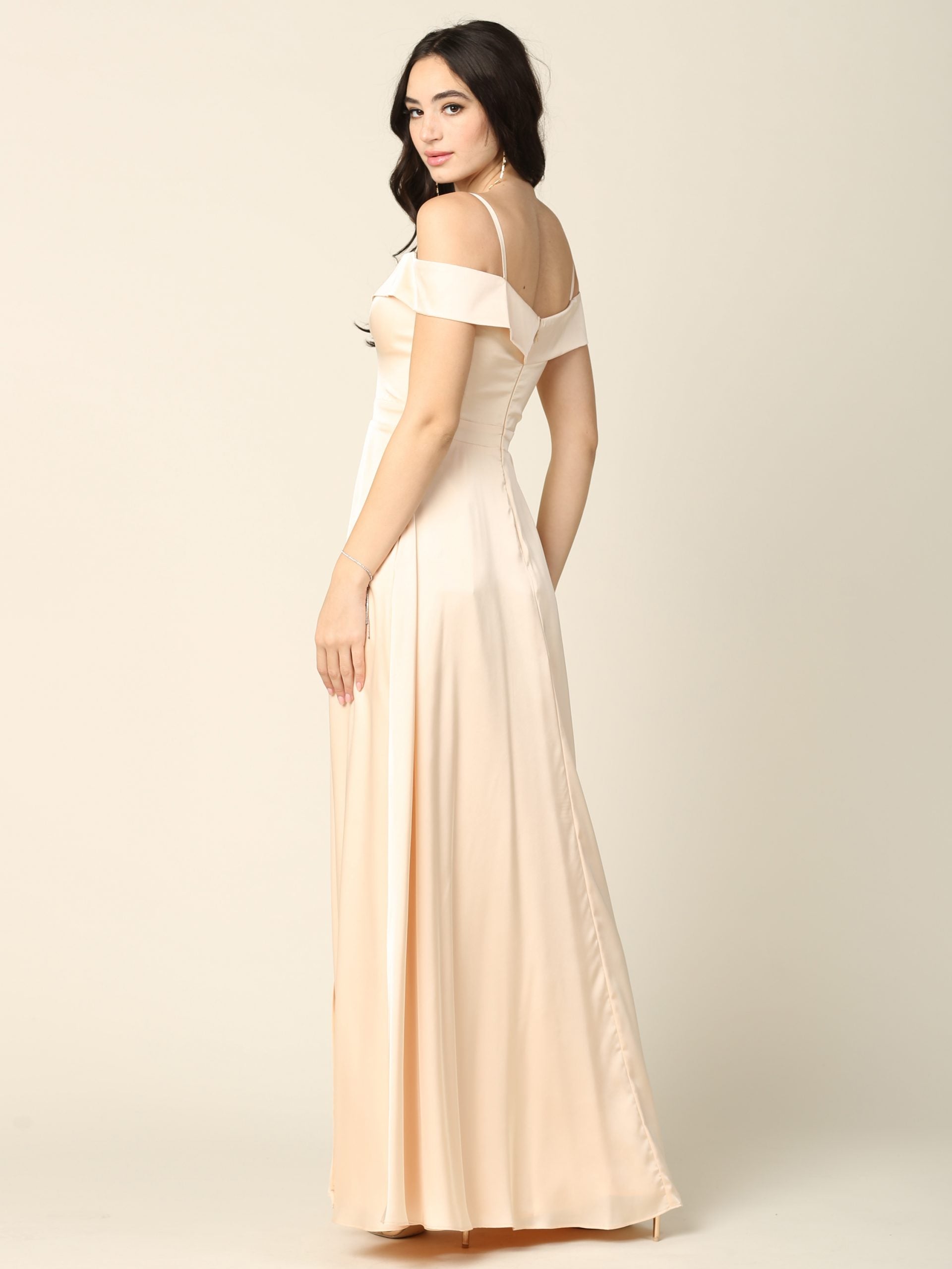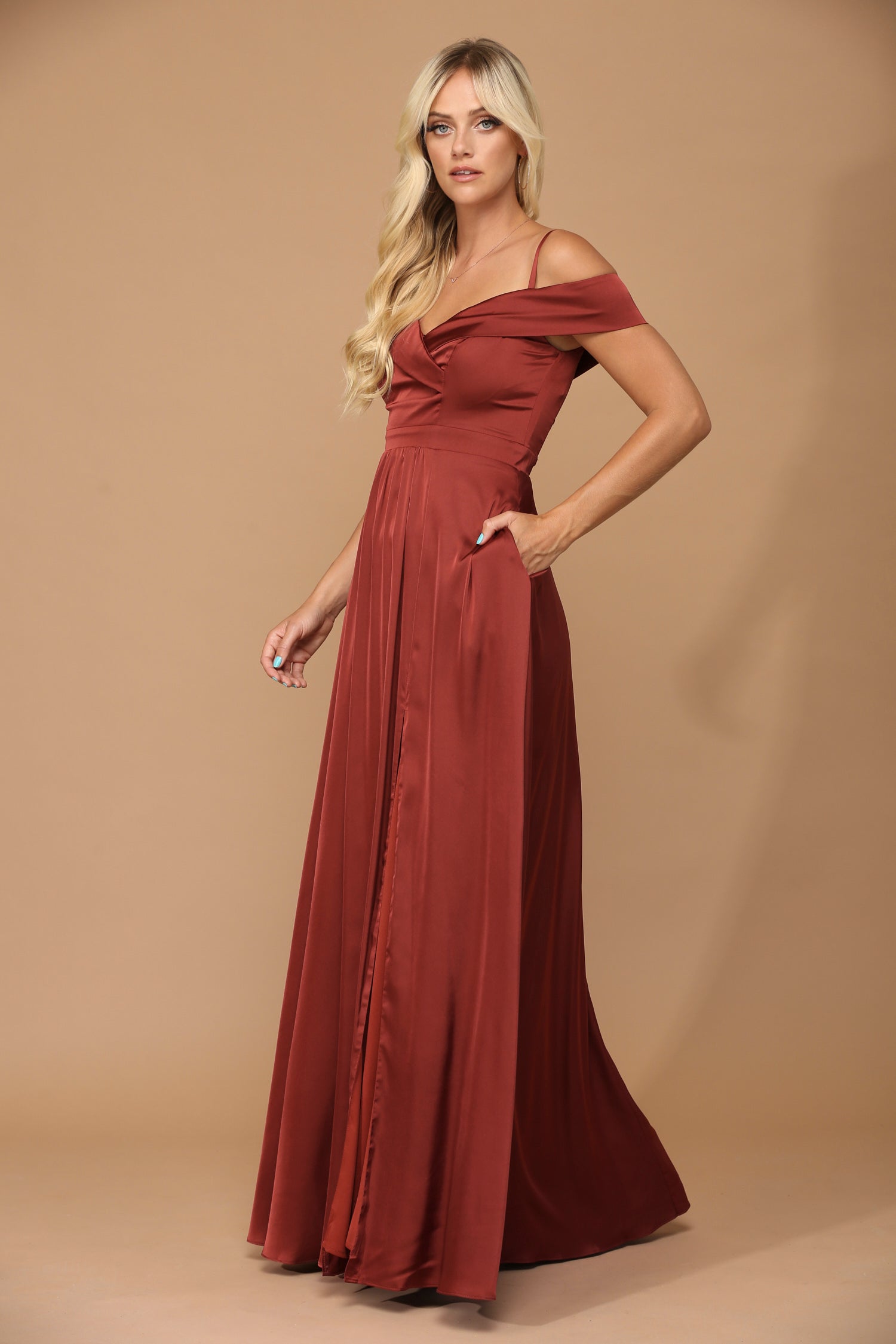 Elevate your bridal party with this stunning satin Eva 3355 bridesmaid dress. The sweetheart neckline features elegant off-the-shoulder styling with delicate spaghetti straps for a romantic, sophisticated look. A high leg slit adds movement and modern flair, while a practical side pocket keeps your phone secure throughout the celebration. The back zipper ensures a smooth, polished finish. Perfect for weddings, formal events, or any special occasion where you want to look and feel your best.