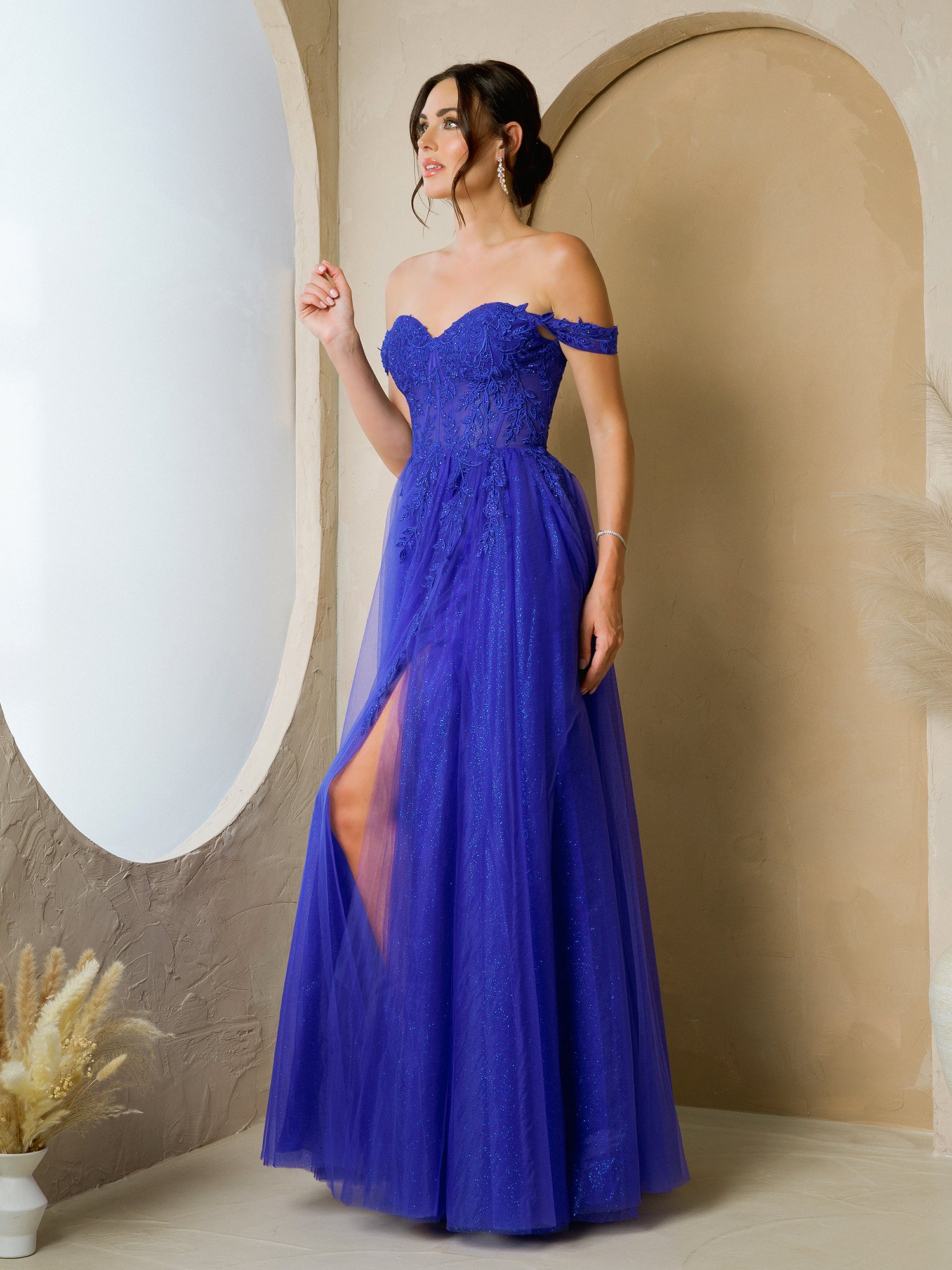 Eva USA 5279 sparkle tulle prom gown with mesh, boned bodice and corset closure to bring the gown in for a perfect fit. Off the shoulder styling and front leg slit add a modern touch. Fully lined with built in bra. Sizes XS to 3X.