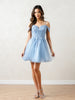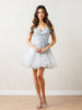 Eva USA 5292 A-line tulle mini dress with monochrome floral appliques along bodice and sleeves. Corset back with zipper. The dress is fully lined with built in bra cups attached. Skirt has a merrow rolled hem. Matching stone details on floral appliques.