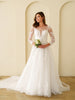Eva USA 5293 tulle and lace A-line wedding gown with lace trimmed sleeves with button closure details. Back has a keyhole detail with a button closure at nape of neck. Deep plunging sweetheart bustline detail. Dress is lined and has built in bra cups attached. Skirt has floral lace appliques adorned throughout and a raw hem. Chapel length train.