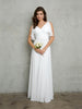 Chiffon gown with v neck and v back. Cold shoulder styling with flutter sleeves. Fully lined with built in bra cups. Sizes XS to 4X.