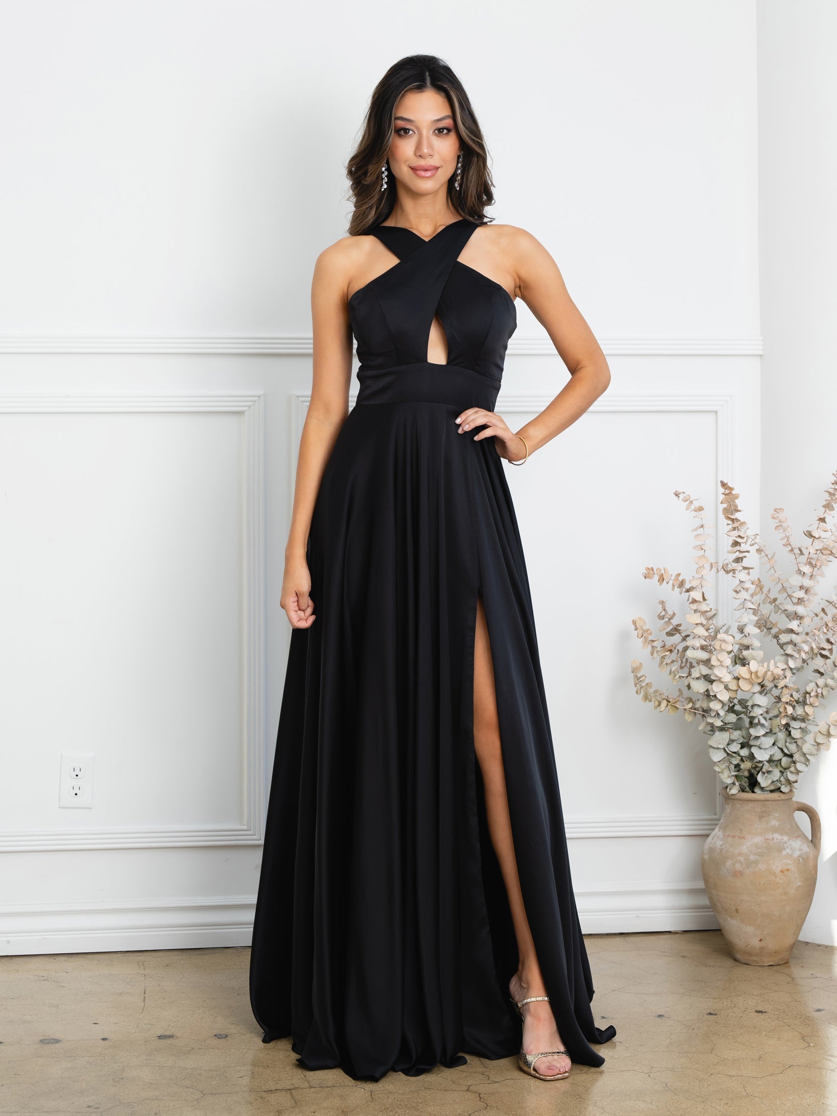 Satin faux halter bridesmaids dress with crisscross neckline, side slit and back zip. Sizes XS to 4X.