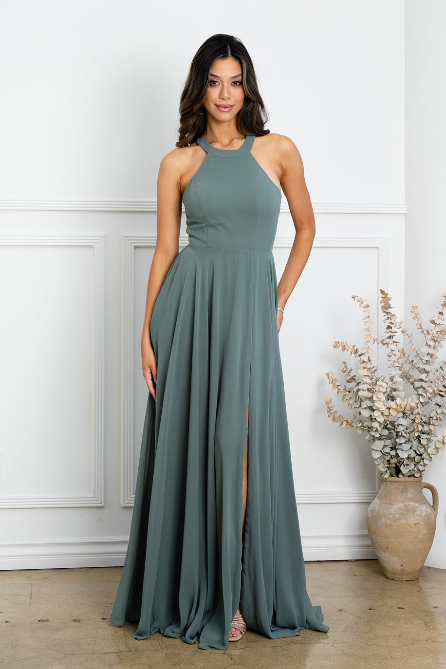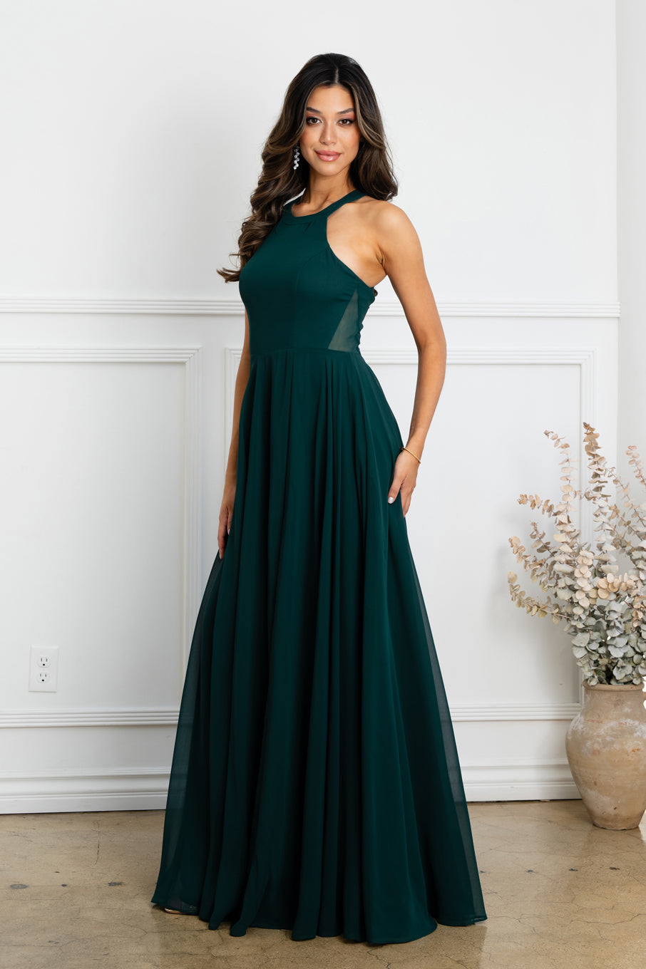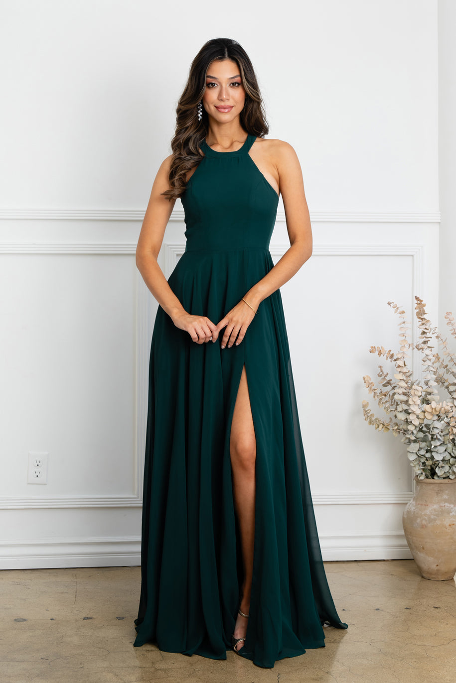 Long chiffon bridesmaid or evening dress with side slit and sheer mesh cutouts on the side of the bodice. Back zip. Sizes XS to 3X.