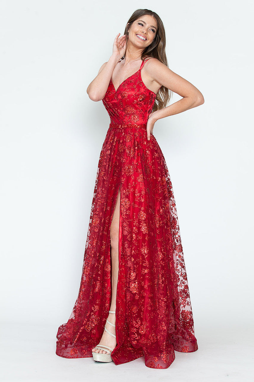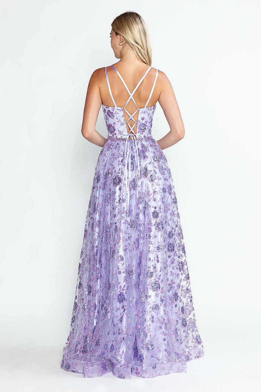 Lenovia 8235 wrap style sheer glitter mesh prom or evening gown with corset back and leg slit.