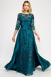 Lenovia 8355 mother of the bride or groom dress in embroidered mesh with sateen overlay. High neckline and 3/4 sleeves.