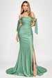 Lenovia 8358 presents an elegant silhouette with off-the-shoulder ribbon straps that frame the neckline beautifully. This fitted stretch gown features a graceful sweep train and a flattering side leg slit for movement. The dress includes detachable spaghetti straps for styling versatility, a built-in bra for support, and a fully lined interior. A hidden back zipper ensures a seamless, polished appearance. Perfect for prom or bridesmaid occasions, this sophisticated design combines comfort with timeless elegance.