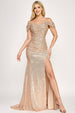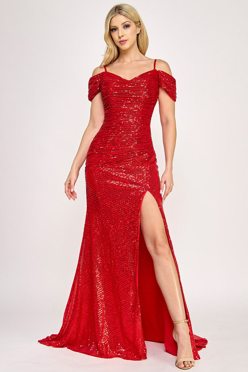 Sequined off the shoulder formal prom, pageant, or military ball dress. This lovely stretch gown has a bodycon bodice with a waist snatch internal waistband. Fully lined, hidden back zipper and built in bra.