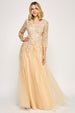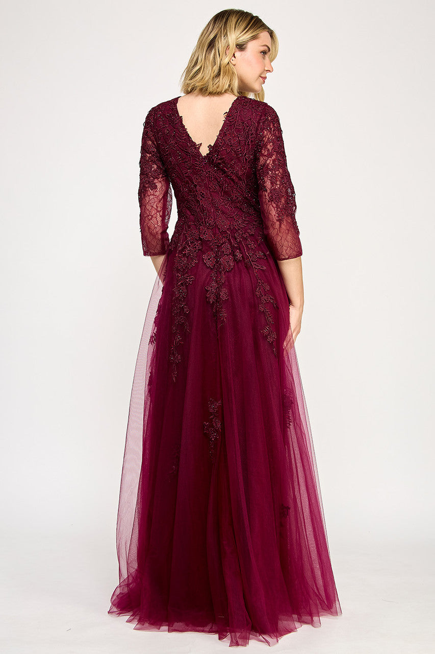 Beautiful embroidered lace formal gown, perfect for mother of the bride or groom OR for your bridesmaids for a winter or fall wedding. Gown has 3/4 sleeves in V-neck styling. This elegant dress is layered and fully lined, with a hidden back zipper and a built in bra.