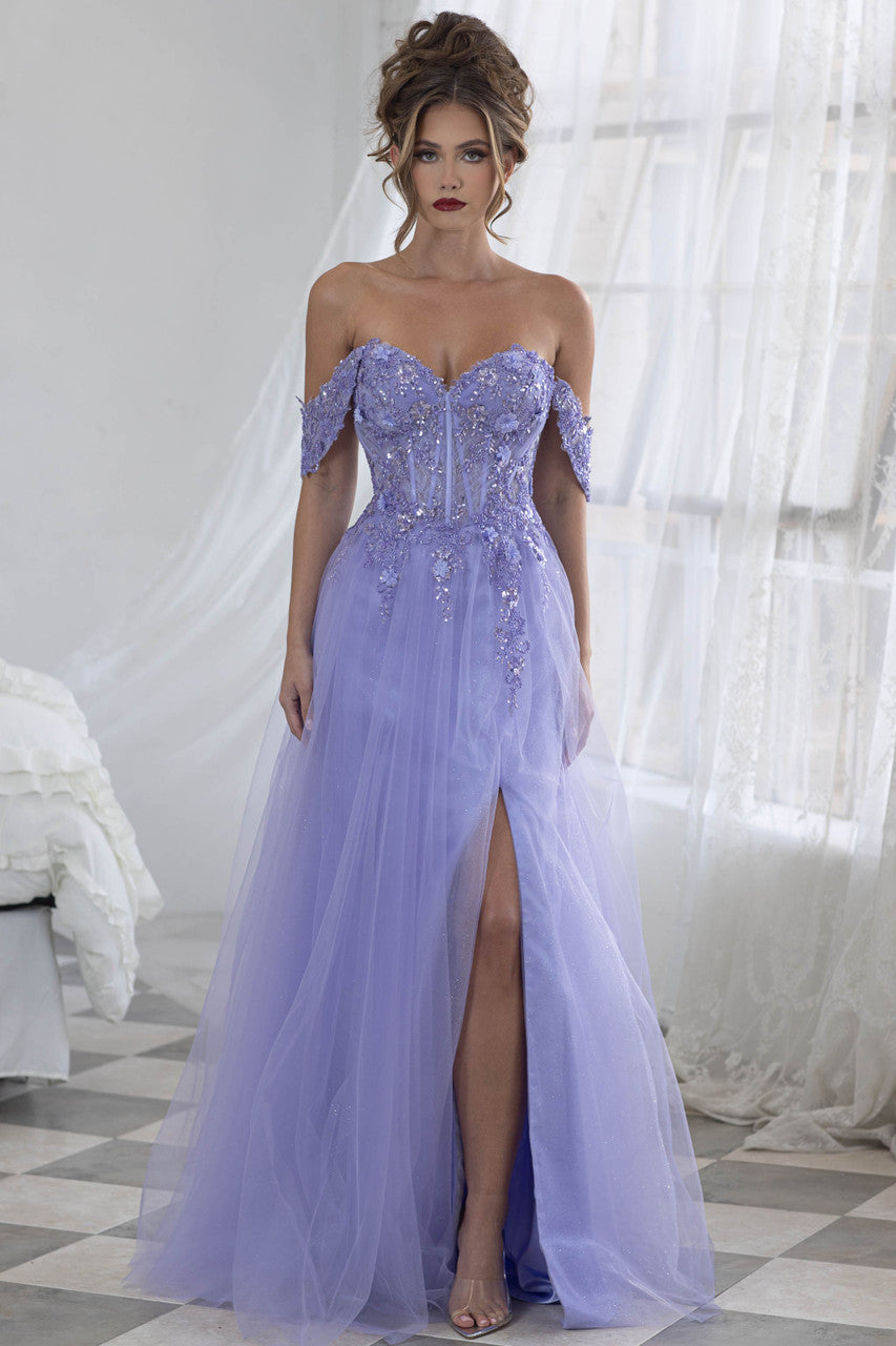 Lenovia embroidered layered mesh formal evening or prom gown with detachable off-the-shoulder straps.