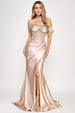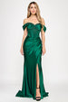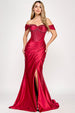 Lenovia 8403 off the shoulder stretch satin gown with beading and detachable shoulder straps. Waist snatching corset style with all around boning in the bodice. Sheer mesh bodice with pleated waist. Fully lined, hidden back zipper and built in bra. Sizes XS to 3X.