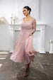 Beautiful Mayqueen MQ2108 mother of the bride or groom dress in tea length. Chiffon dress with embroidered mesh lace bodice with 3/4 length sleeves. V-neck and high zipper back. Fully lined with built in bra. All around great dress.