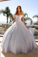 Beautiful, full Nox Anabel Quinceanera gown with floral applique and off the shoulder styling. The sheer, boned bodice is accented with floral lace and a sweetheart neckline. Corset back closure with zipper.