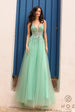 Beautiful Nox Anabel tulle and lace formal prom gown with deep V neck and V back with zipper. Fully lined, built in bra.