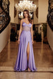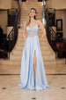 Nox Anabel A1738 A-line prom gown with boned corset bodice. The twist style front and delicate spaghetti straps provide style and support. Thigh-high slit, fully lined, built in bra.