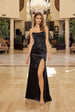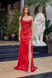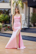 Nox Anabel A1753 strapless stretch satin formal prom gown. Peaked pleated neckline accented with sequined floral applique throughout the sheer boned bodice. Thigh-high leg slit with side pleating on skirt. Zipper back with sweep train.