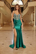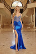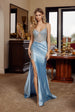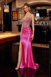 Slip into pure glamour with this show-stopping Nox Anabel C1832 prom and evening gown that's designed to turn heads. The fitted shimmer stretch jersey hugs your curves beautifully, while the sheer mesh bodice adorned with woven rhinestones adds an irresistible sparkle. A daring plunging sweetheart neckline and rhinestone-studded spaghetti straps frame your shoulders perfectly. The thigh-high leg slit features rhinestone accents along the hip panel for extra pizzazz, and a graceful court-length train completes this jaw-dropping look. Perfect for making your grand entrance unforgettable.