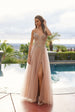 Nox Anabel C1843 mesh prom gown with peaked neckline. The boned bodice is accented with sequins and a lace-up back closure. The beautiful glitter dusted skirt falls into a thigh-high leg slit for ease of movement. Fully lined, built in bra cups.