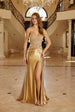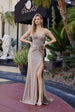 This stunning Nox Anabel E1903 gown features delicate spaghetti straps and a flattering V neckline that frames the shoulders beautifully. The full sequined bodice catches the light with every movement, while sheer boned panels at the waist provide structure and support. Ruched satin details along the hips create an elegant silhouette, and a dramatic leg slit adds modern flair. Finished with luxurious satin fabric and a sweeping train, this dress makes an unforgettable statement for your special day.