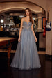 Nox Anabel F1726 floor length shimmer tulle prom gown. Sheer boned waist with beaded applique and lace-up back with sweeping train.
