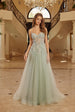 Nox Anabel G1787 floor length shimmer illusion tulle formal prom gown. Lovely A-line style with sweetheart neckline, boned illusion waist, and leg slit.