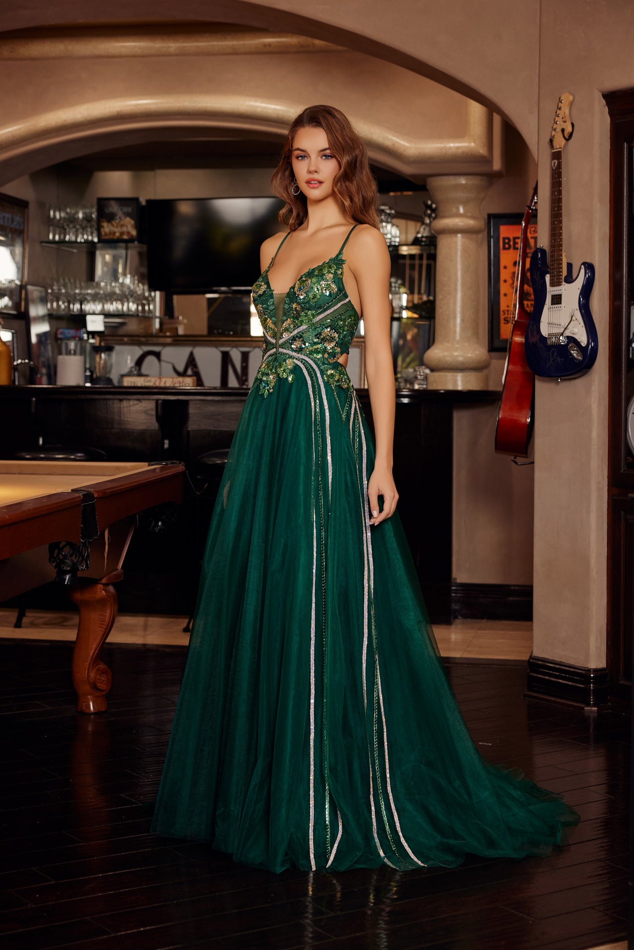 Nox Anabel G1795 floor length tulle prom gown with embroidery accented with sequins and beading. Plunging V neckline with spaghetti straps and sheer boned waist. Crisscross back straps and sweep train.