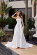 Nox Anabel JW1045 Elegant strapless satin gown featuring a structured boned bodice that creates a flawless silhouette. The straight neckline gracefully frames the shoulders and collarbone, while the pleated skirt flows seamlessly into a chapel-length train. A timeless A-line design perfect for the modern bride seeking understated sophistication and refined beauty on her wedding day.