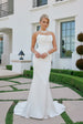 This exquisite Nox Anabel JW1047 creation showcases a fitted silhouette in sumptuous stretch satin that follows your every contour. The elegant cowl neckline drapes with fluid grace, anchored by delicate spaghetti straps for understated support. A striking column of buttons adorns the back, descending gracefully into a chapel-length train that adds dramatic presence. Designed for the discerning bride who appreciates refined tailoring and architectural elegance.
