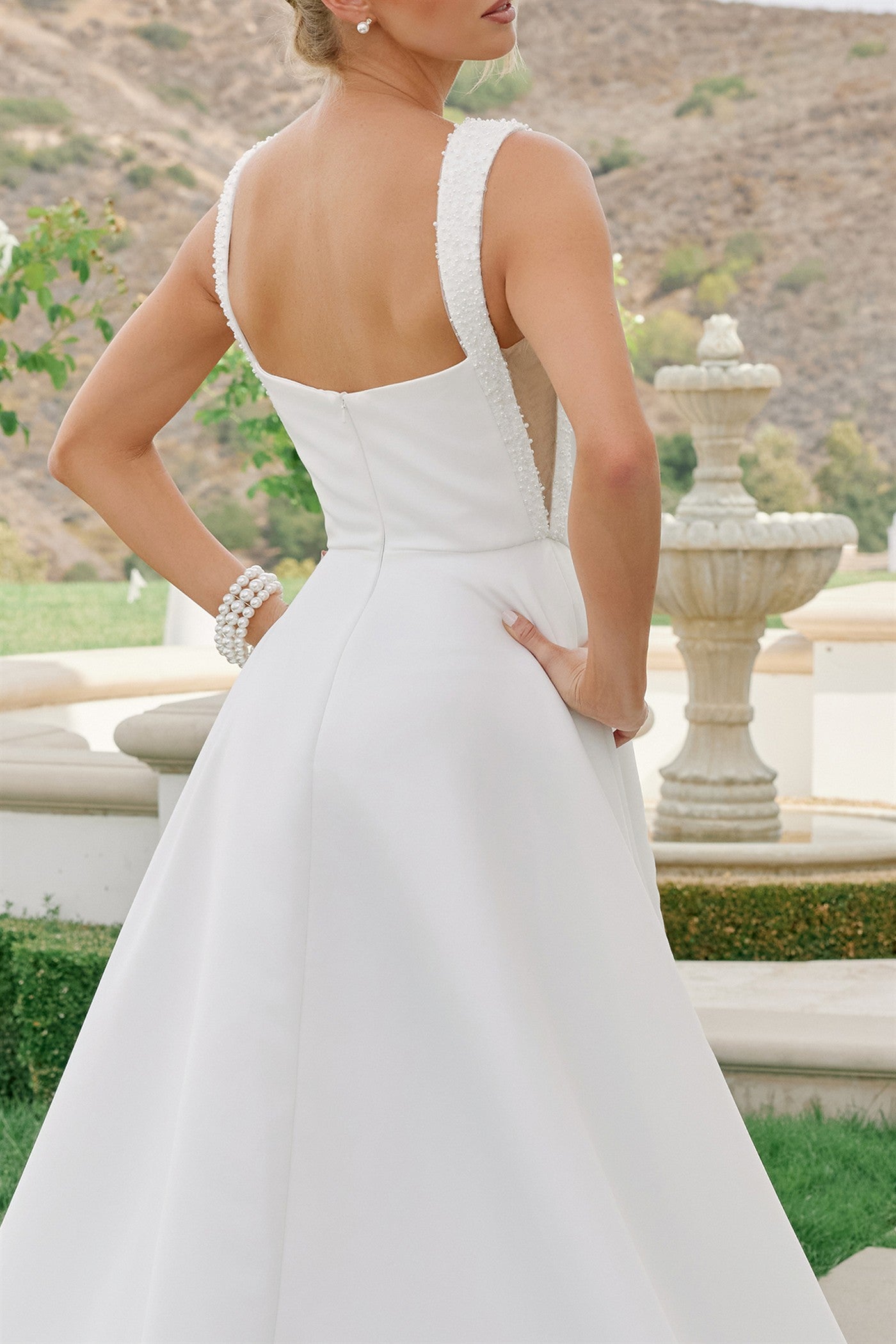 Nox Anabel JW1048 presents an elegant A-line silhouette crafted in luxurious satin. The sophisticated straight neckline is complemented by off-the-shoulder beaded sleeves that transition into intricate beading cascading down the bodice, creating a stunning focal point. A discreet back zipper ensures a seamless finish while the flowing chapel-length train adds dramatic movement and timeless grace. Perfect for the modern bride seeking refined elegance with architectural detail.