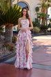 This stunning A-line gown features a delicate chiffon floral print perfect for spring celebrations. The strapless design showcases a pleated bustline and waistline, while lace-up cutout sides add an elegant touch. A back zipper ensures easy wear, and the multi-layered ruffled skirt creates beautiful movement and dimension. Ideal for prom, formal events, or special occasions where you want to feel graceful and feminine.