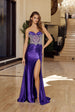 Nox Anabel T1854 is a stunning strapless gown crafted from luxurious shiny satin. The fitted silhouette features intricate silver sequined embroidery throughout, creating eye-catching sparkle and movement. A daring plunging neckline draws attention to the bodice, while the lace-up back adds an elegant touch of detail. The high slit allows for graceful movement, and a sweeping train completes this show-stopping formal look. Perfect for weddings, galas, or any special occasion where you want to make an unforgettable entrance.