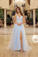 Make a dramatic entrance in this Nox Anabel Y1799 floor-length shimmer tulle ball gown designed to captivate. The plunging V neckline and matching deep V back create striking front and back appeal, while the thigh-high leg slit adds contemporary flair and movement. Intricate flower appliqués adorned with beading and sequins embellish the bodice, drawing attention upward with dimensional detail. A graceful sweep train completes the silhouette, offering elegance and sophistication. Ideal for prom, formal galas, or black-tie events where you want to command attention with refined glamour.