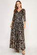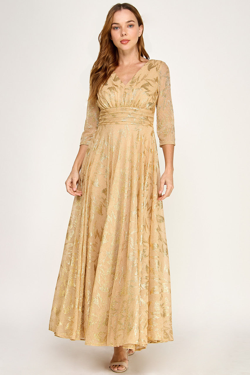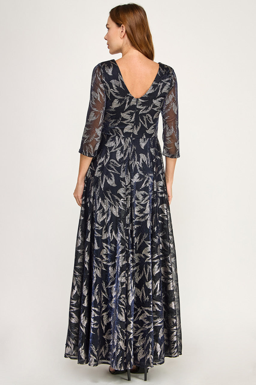 Perrty by Lenovia 3125 floor length foil fabric gown in floral pattern. V neck styling with 3/4 sleeves and back zipper. Would make a great mother of the bride or groom gown or a more conservative bridesmaid dress.